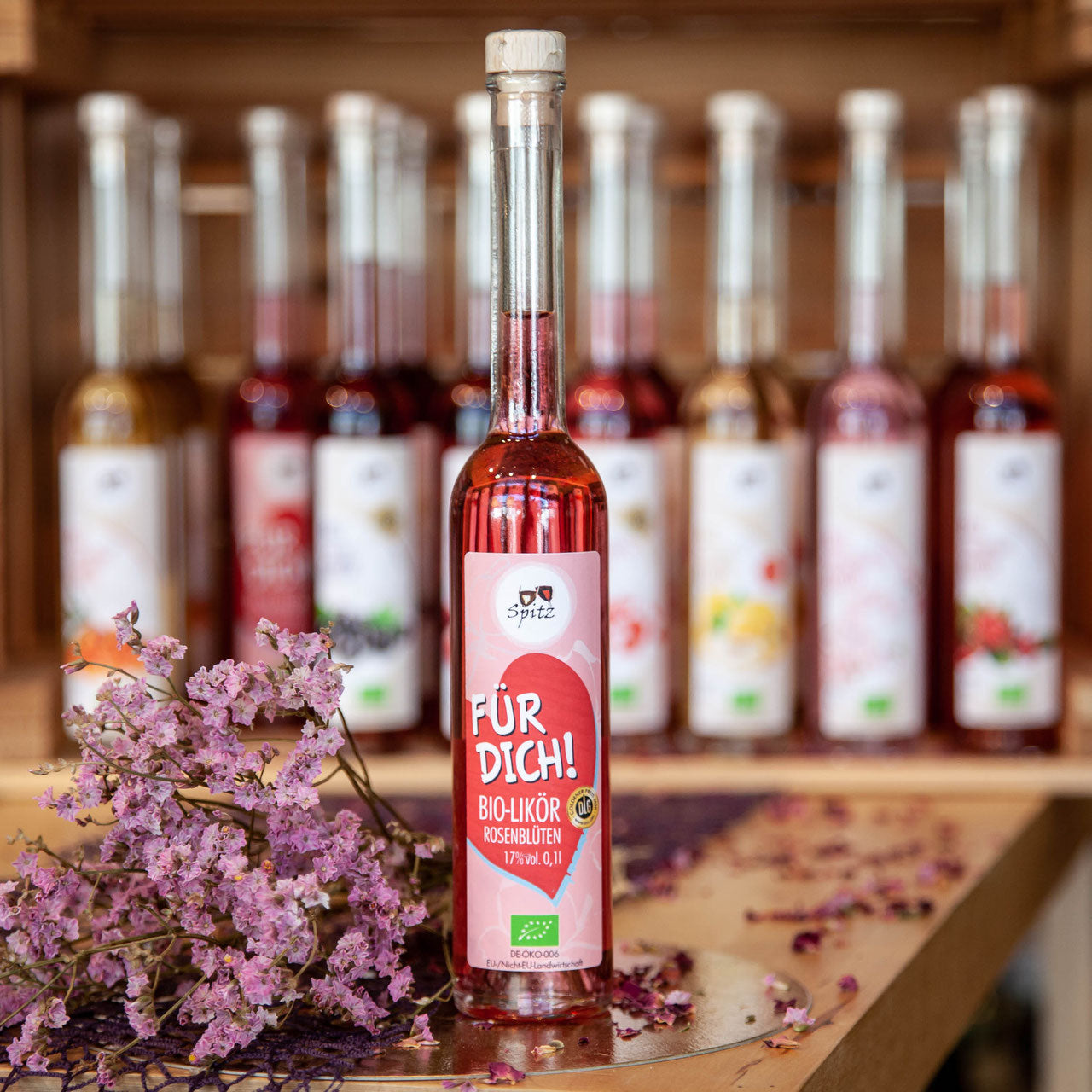 Verschenken Sie den "Für dich!" Rosenblüten Likör und bereiten Sie eine kleine Freude. Der Geschmack von zarten Rosenblüten begeistert und krönt den Rosenstrauß.