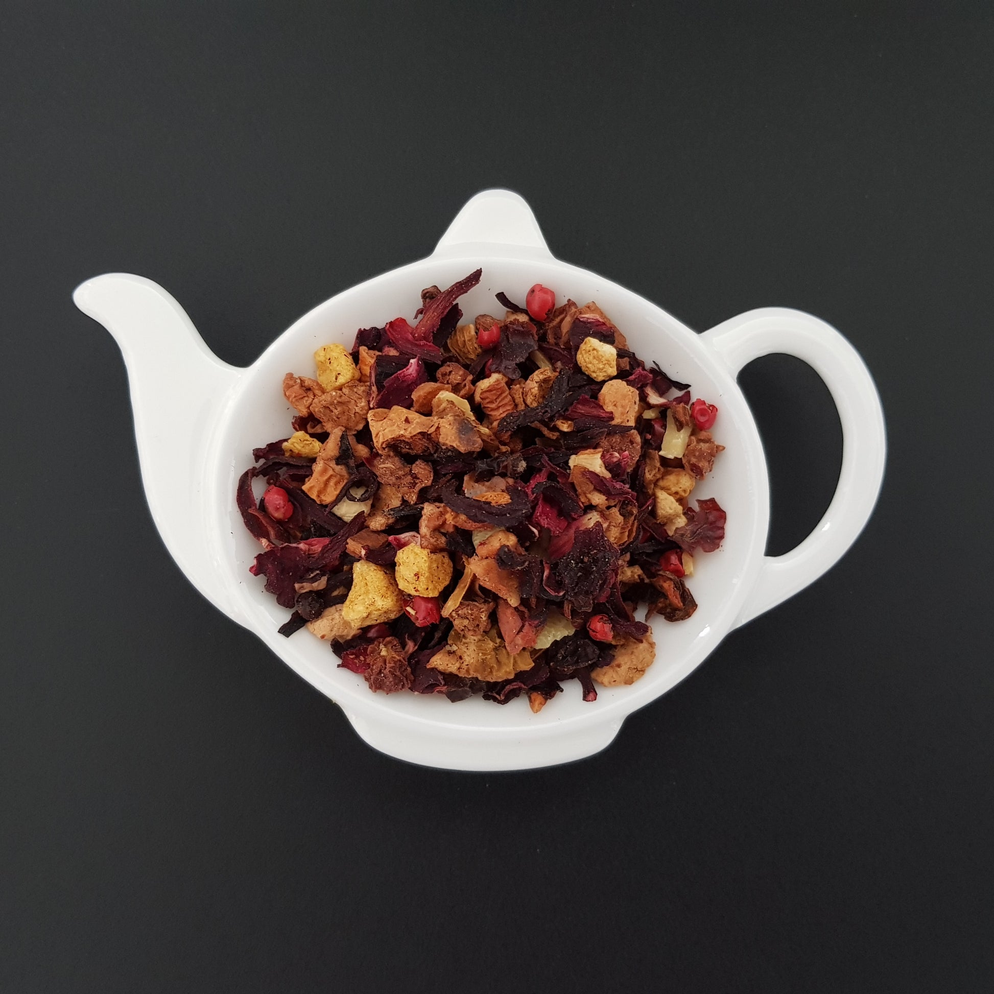 Zutaten: Apfelstücke, Hibiskusblüten, Orangenschalen, Hagebuttenschalen, MANDELstücke, Rosa Pfeffer, Zimtstücke, Orangengranulat (Orangensaftkonzentrat, Orangenzellen), Aroma, natürliches Aroma.